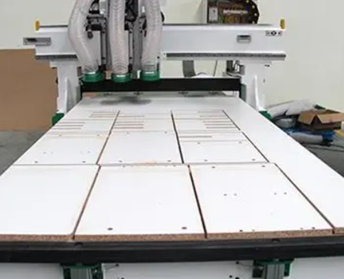 传统开料设备是通过电子开料锯将一张整板经过纵向、横向裁切成不同规格的板材。本生产线开料工艺采用加工中心,除具有自动抓取、推送板材功能外,还可通过识别标签获取开料加工信息,自动调节加工参数,可实现板材的高效锯切作业。为提高生产效率,可在开料设备前增设智能线控分流装置,利用该装置实现多台开料设备同时加工作业。